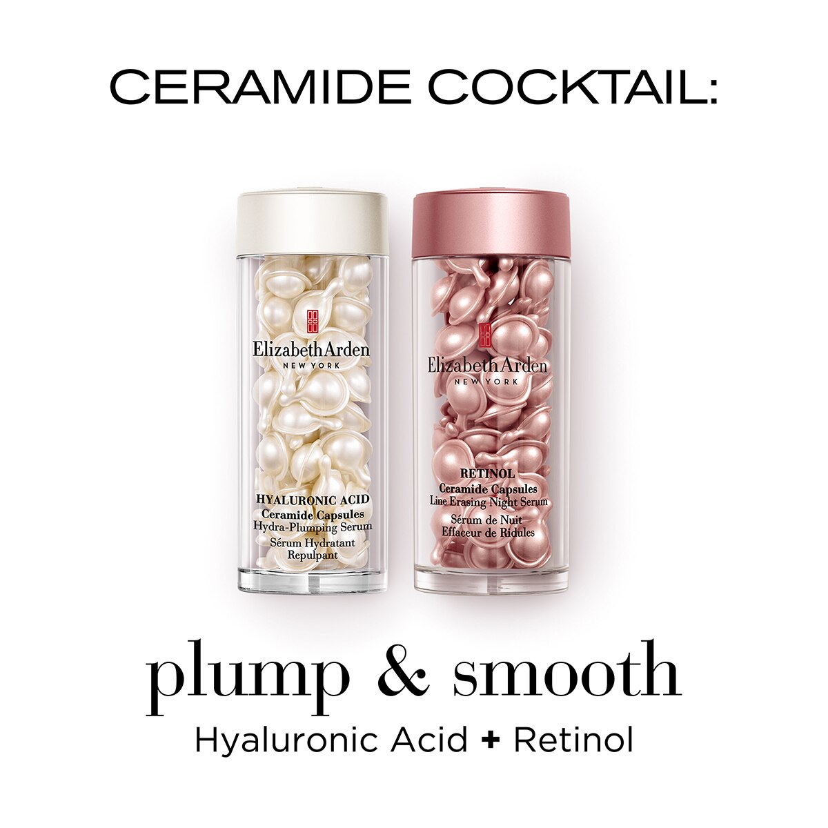Elizabeth Arden 90ct. Ceramide Hyaluronic Hydration System™. Skincare with a twist. Formulated for maximum potency and encapsulated for purity, for visibly plumper, firmer, and hydrated skin. Powered by moisture sealing Double-Lock Hydration, this silky, lightweight serum combines two essential youth factors in a single-dose capsule.